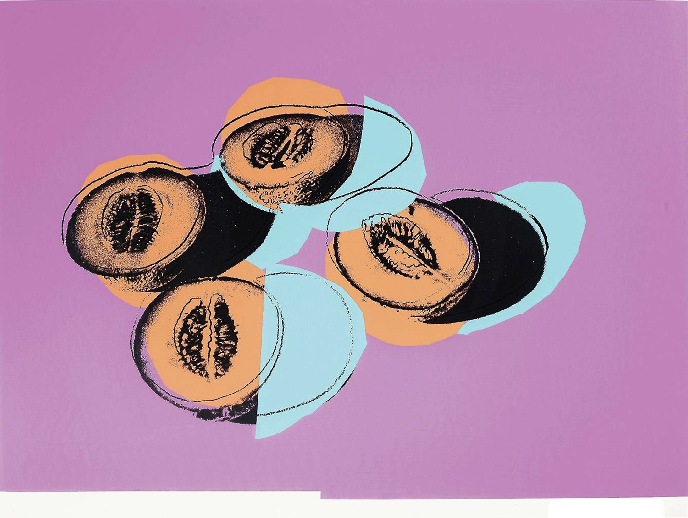 Cantaloupes II (from Space Fruit), 1979 exemplifies this mature phase of Warhol’s practice. The composition elevates an ordinary fruit into a monumental, almost cosmic presence, using vivid color contrasts and crisp screenprinting to emphasize form, texture, and flatness. Executed as an original screenprint on Lenox Museum Board, the work underscores Warhol’s fascination with abundance, desire, and the aesthetics of display—hallmarks of his late Pop imagery. The piece bears the Andy Warhol Authentication Board stamp on the verso and is accompanied by a letter of authenticity issued by the Estate of Andy Warhol. Measuring 30 × 40 inches (76.2 × 101.6 cm), Cantaloupes II stands as a confident and collectible example of Warhol’s ability to transform the mundane into the iconic.