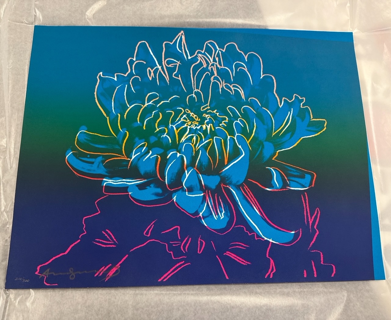 In 1983, Andy Warhol created the artwork titled "Kiku," showcasing his continued exploration of cultural symbolism and artistic expression. The piece features the image of a chrysanthemum, or kiku in Japanese, rendered in Warhol's distinctive style of bold colors and repetitive patterns. The use of the chrysanthemum, a significant flower in Japanese culture symbolizing longevity and the imperial family, adds a layer of cultural depth to Warhol's oeuvre. "Kiku" stands as a testament to Warhol's ability to transcend traditional boundaries and engage with global influences, demonstrating his enduring impact on the art world.