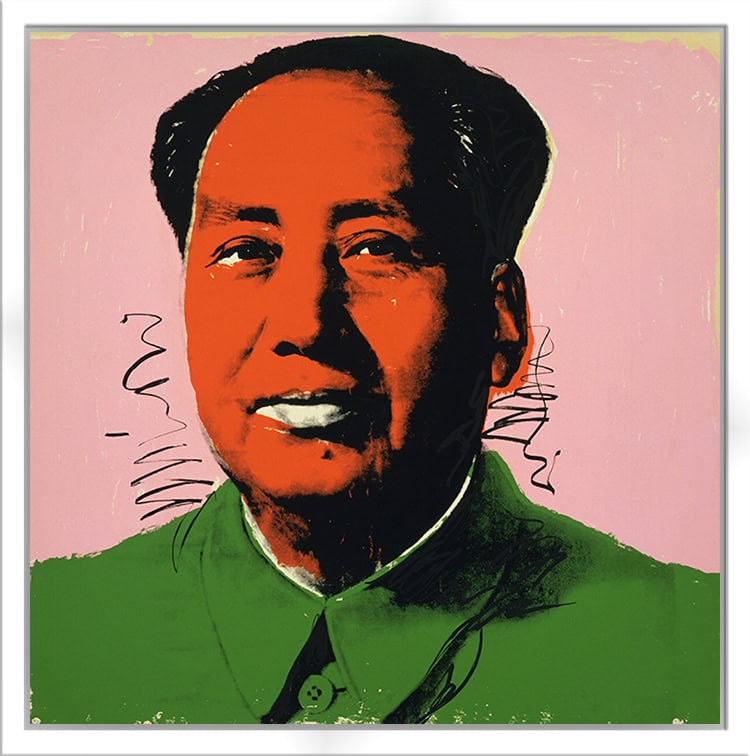 Warhol’s Mao series, first produced in 1972, exemplifies these concerns through its focus on Mao Zedong, one of the most reproduced political images of the twentieth century. Using a propaganda portrait as his source, Warhol transformed Mao’s likeness into a bold, confrontational image through exaggerated color, painterly marks, and repeated variations across editions. The resulting prints oscillate between reverence and irony, turning a symbol of communist authority into a commodified Pop icon. In presenting Mao through the same visual language he used for celebrities, Warhol collapses distinctions between political power and celebrity culture, highlighting how ideology, image, and mass media converge in the construction of modern identity.