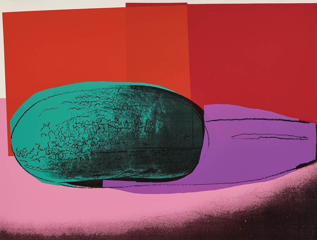 Watermelon (from Space Fruit), 1979 exemplifies this mature phase of Warhol’s practice. The composition elevates an ordinary fruit into a monumental, almost cosmic presence, using vivid color contrasts and crisp screenprinting to emphasize form, texture, and flatness. Executed as an original screenprint on Lenox Museum Board, the work underscores Warhol’s fascination with abundance, desire, and the aesthetics of display—hallmarks of his late Pop imagery. The piece bears the Andy Warhol Authentication Board stamp on the verso and is accompanied by a letter of authenticity issued by the Estate of Andy Warhol. Measuring 30 × 40 inches (76.2 × 101.6 cm), Watermelon stands as a confident and collectible example of Warhol’s ability to transform the mundane into the iconic.
