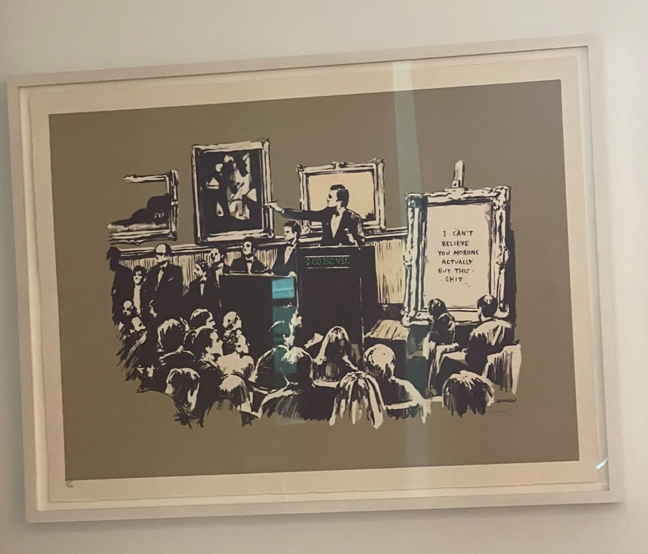 Banksy’s Morons Sepia (2008) is one of the artist’s most incisive and enduring critiques of the art market, blending his sharp wit with a biting sociopolitical message. The work depicts a mock auction scene in which a suited auctioneer gestures toward a framed sign that reads, “I CAN’T BELIEVE YOU MORONS ACTUALLY BUY THIS SHIT,” a phrase that satirically exposes the contradictions, excesses, and self-importance of the art world. Crafted as a screenprint in colors on wove paper, the piece showcases Banksy’s signature blend of dark humor, bold graphic clarity, and provocative commentary, pushing viewers to question the value systems and cultural hierarchies that drive the contemporary art economy.