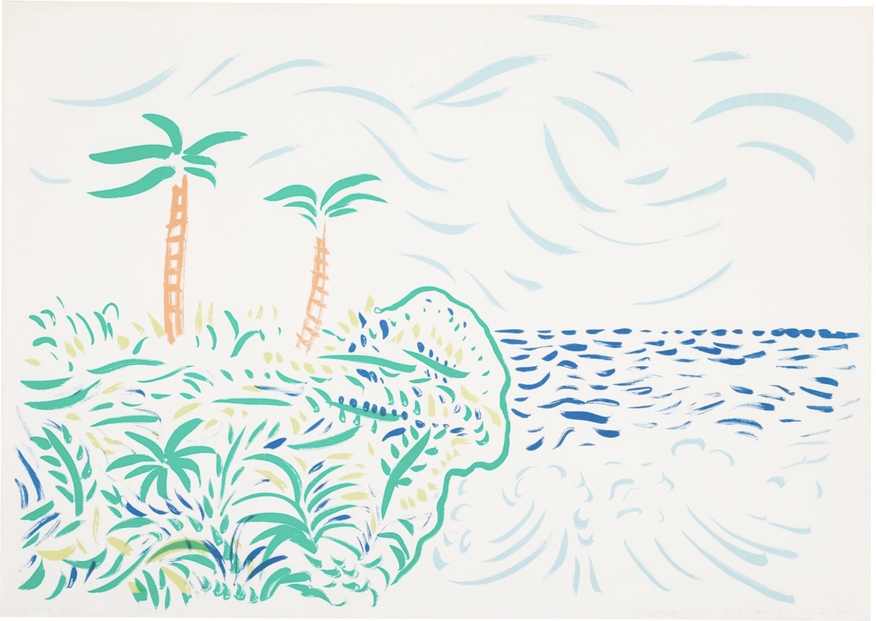 This lithograph, printed in colors on wove paper, is signed, dated, and numbered from a limited edition of 100, underscoring its value and collectability within Hockney’s broader printmaking practice. Measuring 33 ⅞ × 47 ⅞ inches, it is an impressively scaled work that amplifies the impact of its lush palette and expansive composition. Hockney has long considered printmaking an essential extension of his artistic voice, and Bora Bora exemplifies his mastery of the medium—its clarity, precision, and saturated color harmonizing to form a work that is at once technically sophisticated and visually inviting. For collectors, this piece offers a vibrant and quintessential example of Hockney’s landscape vision, encapsulating his ability to transport viewers to places alive with color and atmosphere.