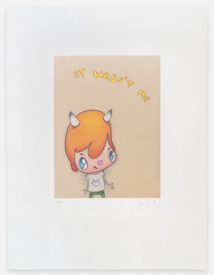 The print It Wasn’t Me (2024) exemplifies Calleja’s distinctive aesthetic through a carefully crafted and technically complex printmaking process. The work is produced using a 15-color engraving with four photopolymer etching plates layered over a digitally printed background, creating a rich interplay between traditional printmaking and contemporary digital techniques. Printed on delicate 65gsm Shin Inbe paper and mounted on 290gsm Fabriano Tiepolo paper, the piece achieves both visual depth and structural refinement, with a final color applied by hand by the printmaker to enhance the composition. It Wasn’t Me is signed and numbered from an edition of 250 and measures approximately 22 × 16.9 inches (56 × 43 cm.), presenting a charming yet sophisticated example of Calleja’s ability to combine technical precision with the emotional immediacy of his beloved wide-eyed characters.