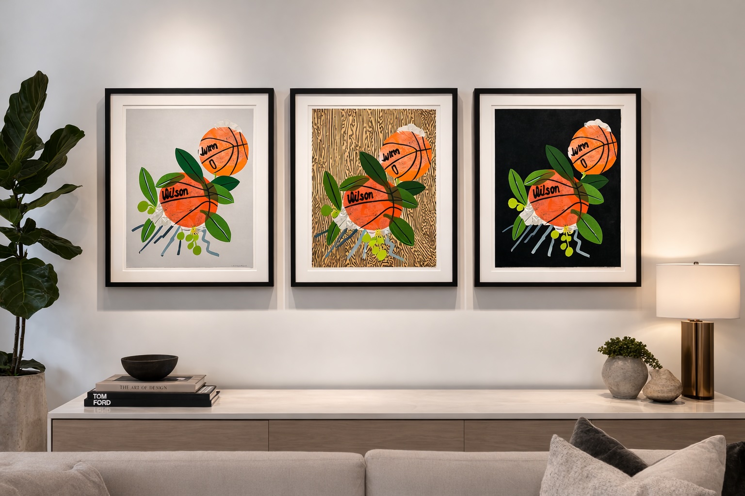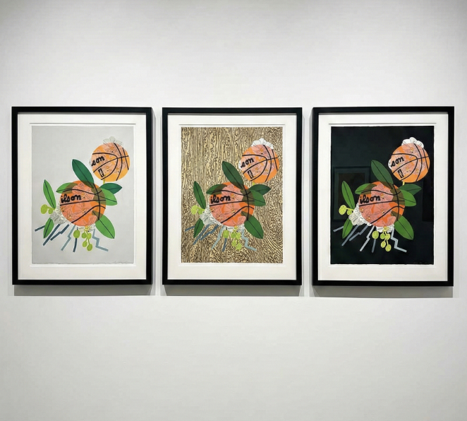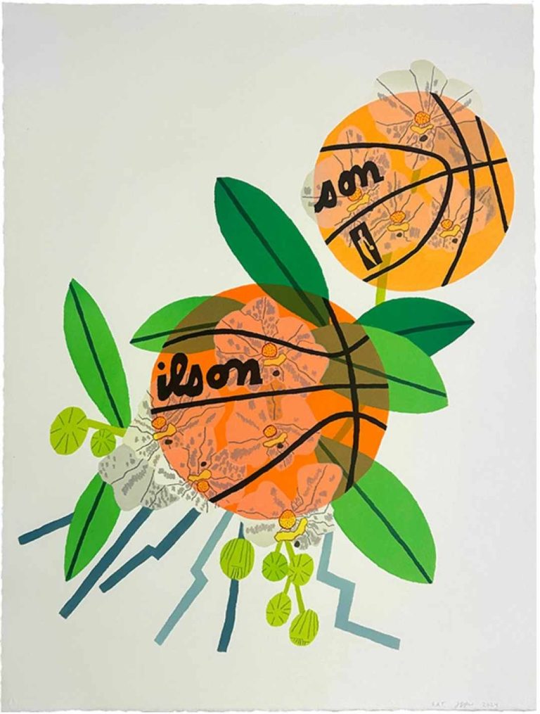 Double Basketball Orchid (State: I, II, III) (2025) exemplifies Wood’s playful blending of botanical and athletic motifs. Produced as a lithographic triptych, the work presents a striking arrangement of basketball forms intertwined with orchid-like leaves and stems, creating a visual dialogue between organic growth and graphic geometry. Each panel measures approximately 13 x 10 inches (33 x 25 cm.), and together the three prints form a dynamic composition that shifts subtly from state to state. Signed and numbered from a limited edition of 30, the triptych highlights Wood’s mastery of printmaking and his ability to transform familiar imagery into rhythmic, layered compositions that are both energetic and visually refined.