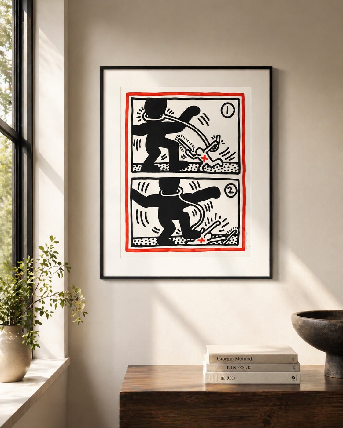 Keith Haring’s Free South Africa is one of his most direct and politically charged works, reflecting his deep engagement with global social justice movements during the 1980s. Created as a lithograph in an edition of 60, and signed and numbered by the artist, the work exemplifies Haring’s ability to distill complex political realities into a stark, universally legible visual language. Measuring 40 × 31 9/10 inches (101.5 × 81 cm.), the composition unfolds in two comic-like panels framed by a bold red border. The imagery is immediate and forceful: a large black figure dominates and subjugates a smaller white figure, reversing expected visual hierarchies and confronting the viewer with the brutality and imbalance inherent in apartheid-era South Africa. The red accents heighten the sense of urgency and violence, while the simplified forms ensure the message is accessible across cultural and linguistic boundaries.