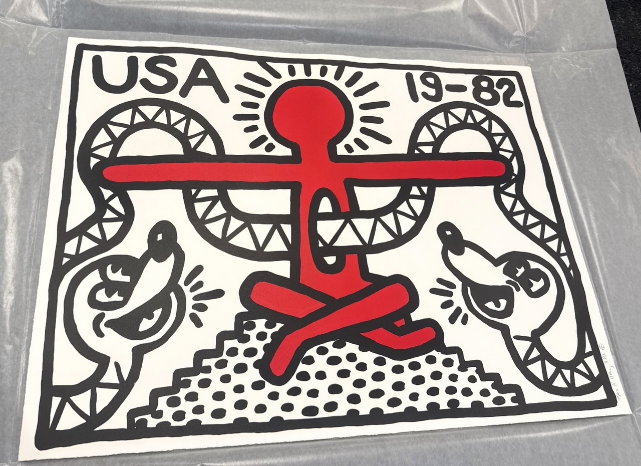 Executed as a lithograph and issued in a small edition of 50, this work is hand-signed, numbered, and dated on the front, underscoring its significance within Haring’s print practice. Measuring 21 3/10 × 28 7/10 inches (54 × 73 cm.), the composition has a commanding horizontal presence that amplifies its graphic impact. While Haring embraced reproducibility as a democratic tool, the rarity of this edition places USA firmly within the realm of highly collectible works. Balancing urgency with clarity, the piece exemplifies Haring’s unique ability to confront national themes through a visual vocabulary that remains instantly recognizable and enduringly relevant.
