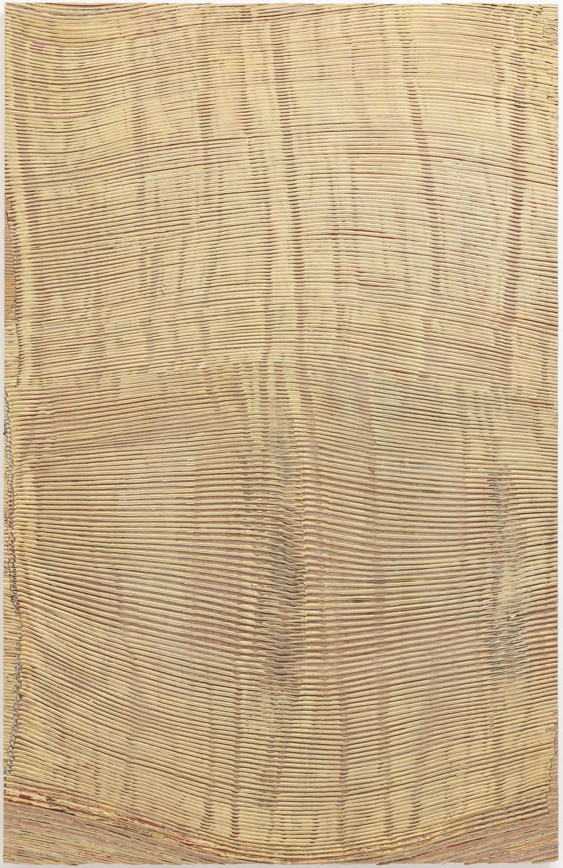Contraposto / Fertility Figure (2007–2020) exemplifies Beltrán’s signature approach. Executed in acrylic latex on wood panel at a scale of 70 × 45 inches, the work reveals a striking surface dominated by luminous yellow-gold tones. Its decorative sophistication is balanced by a sculptural physicality, inviting viewers to experience it simultaneously as image, object, and architectural presence. The title evokes both classical form (contrapposto) and primal archetype (fertility figure), underscoring the artwork’s dialogue between timeless human references and the modernist language of material abstraction. With its radiant palette and commanding scale, this piece stands as a powerful example of Beltrán’s ability to transform industrial mediums into works of striking elegance and depth.