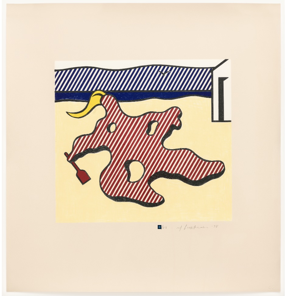 Nude on Beach, 1978 is a refined example of this mature phase. Executed as a lithograph on Arches 88 paper, the composition presents a stylized female figure rendered with crisp contours, controlled color fields, and rhythmic dot patterns that suggest light and texture without naturalistic modeling. Signed and numbered from a limited edition of 38, the work reflects Lichtenstein’s meticulous approach to printmaking and his interest in the dialogue between mechanical reproduction and fine art. Measuring 25 3/4 × 24 1/2 inches (65.4 × 62.2 cm), Nude on Beach stands as a highly collectible work that encapsulates Lichtenstein’s ability to reinterpret a timeless subject through the lens of Pop, merging visual wit with enduring art-historical resonance.