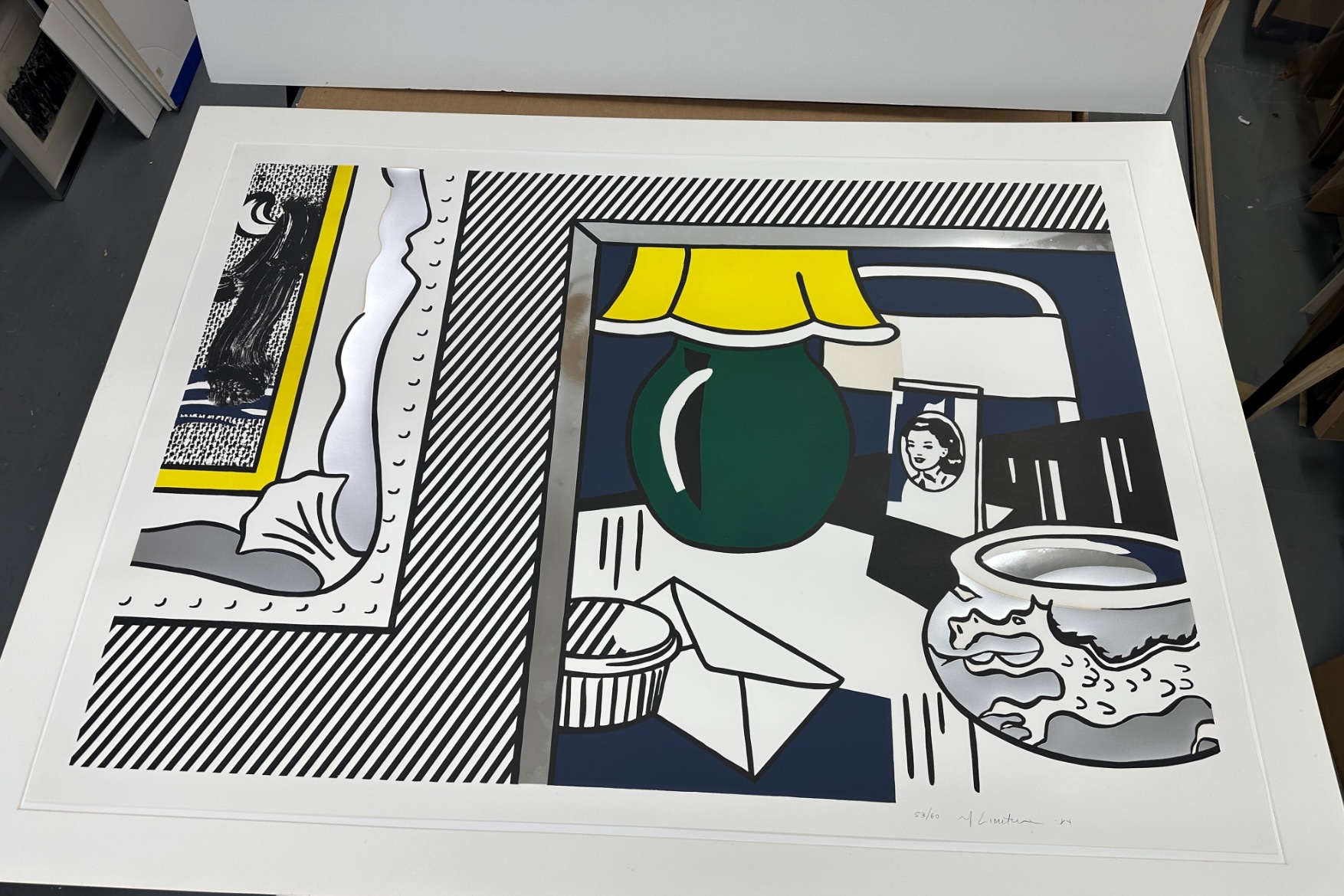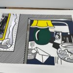 In Two Paintings: Green Lamp, Lichtenstein turns inward, reflecting on the act of painting through the lens of Pop Art. The juxtaposition of two panels suggests both repetition and variation, echoing the artist’s ongoing dialogue with modernist masters while simultaneously questioning notions of originality and authenticity. The “brushstrokes” are not spontaneous marks but carefully constructed images, emphasizing Lichtenstein’s fascination with the codification of visual language. By incorporating collage elements alongside traditional printmaking techniques, he further blurs the boundaries between mediums, reinforcing the idea that painting, in the contemporary era, is as much about interpretation and reproduction as it is about direct expression. The result is a work that is both visually immediate and conceptually layered, underscoring Lichtenstein’s enduring influence on the discourse of postwar art.