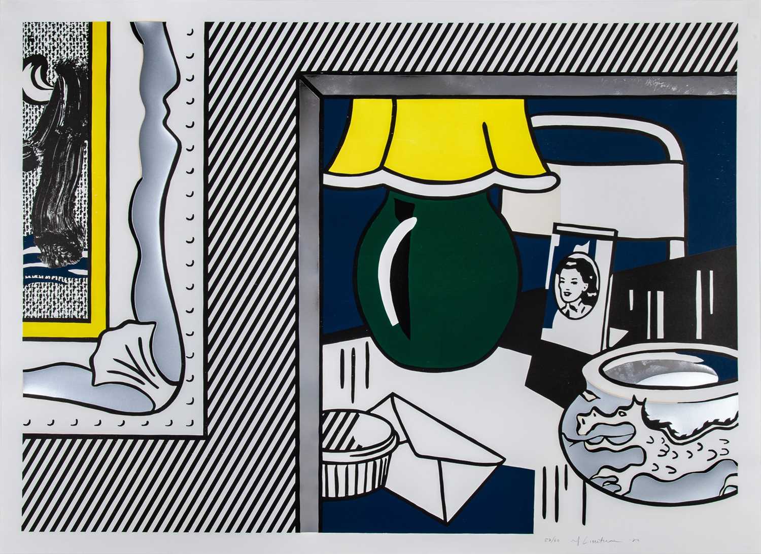 Roy Lichtenstein’s Two Paintings: Green Lamp (1984) is a striking example of his late exploration of art history, reproduction, and the language of painting itself. Executed as a complex combination of color woodcut, lithograph, screenprint, and collage on Arches 88 paper, the work belongs to his celebrated Paintings series, published by Gemini G.E.L., Los Angeles. Measuring 38 5/8 × 53 inches (98 × 134.7 cm.) and signed, dated, and numbered from an edition of 60, the composition presents a diptych-like format in which a stylized green lamp becomes the central motif. Lichtenstein layers bold outlines, Ben-Day dots, and flat fields of color with gestural brushstroke imagery, creating a deliberate tension between mechanical reproduction and the illusion of painterly expression.